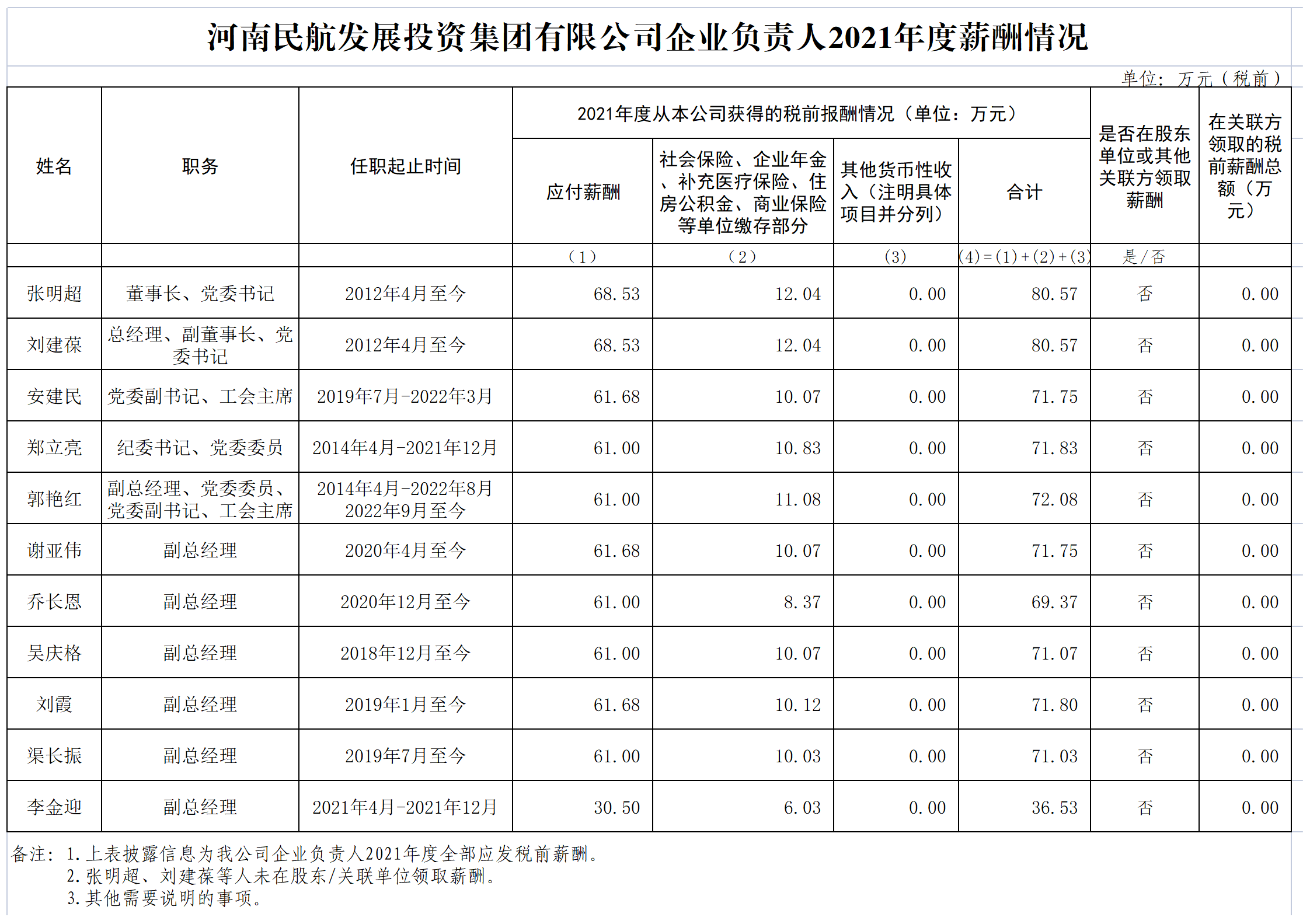 河南民航發(fā)展投資集團(tuán)有限公司企業(yè)負(fù)責(zé)人2021年度薪酬情況