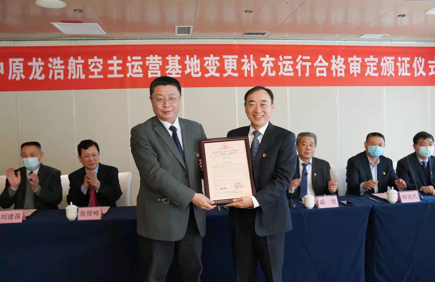 3月4日上午,民航中南地區(qū)管理局局長(zhǎng)馬兵在鄭州向中原龍浩航空有限公司頒發(fā)了《航空承運(yùn)人運(yùn)行合格證》,這標(biāo)志著中原龍浩的主運(yùn)營(yíng)基地由廣州變更至鄭州新鄭國(guó)際機(jī)場(chǎng),進(jìn)入了鄭州廣州“雙基地”協(xié)同聯(lián)動(dòng)、充分運(yùn)營(yíng)的新階段。河南省財(cái)政廳黨組成員、副廳長(zhǎng)趙慶業(yè)與馬兵共同參加頒證儀式并致辭,民航河南監(jiān)督管理局局長(zhǎng)戚俊主持儀式。頒證結(jié)束后,馬兵等參觀了中原龍浩AOC運(yùn)行控制大廳。