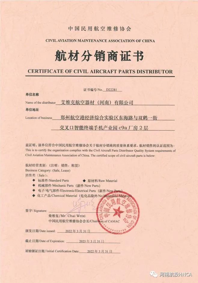 07 河南首家 填補空白 艾維克河南公司取得《航材分銷商證書》
